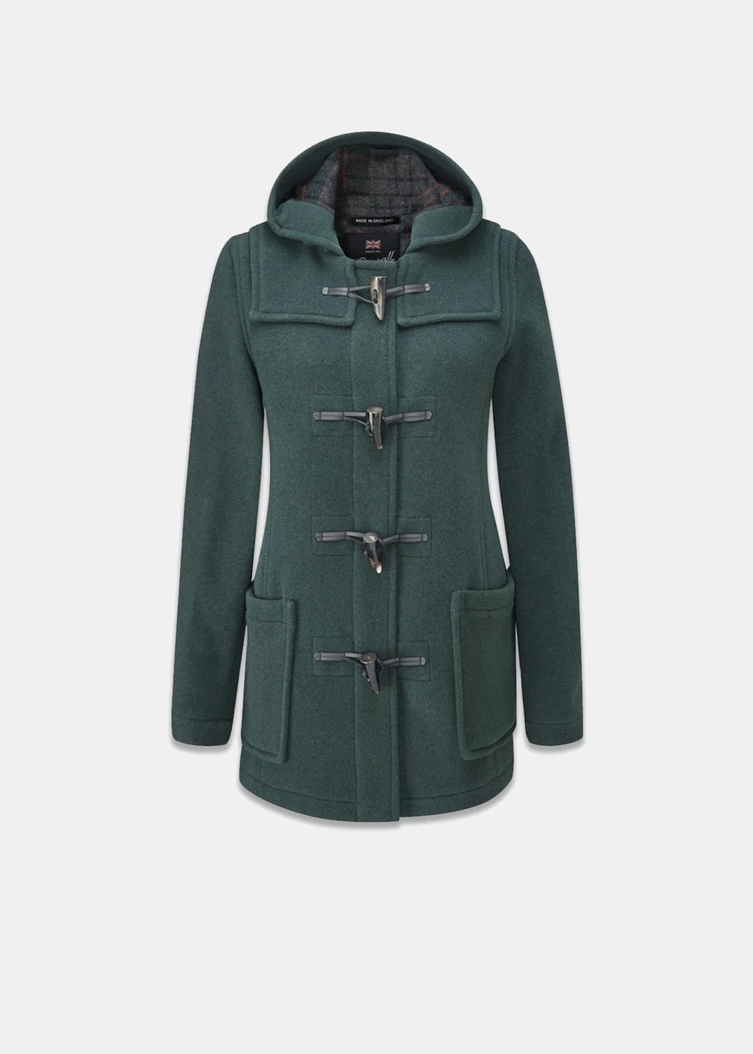 With its contrasting checkback fabric and sturdy fixed shoulder cape, this duffle is equal parts eye-catching and functional.